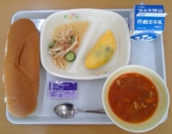 コッペパン 牛乳 ブルーベリージャム チーズオムレツ 大根サラダ ポークビーンズ