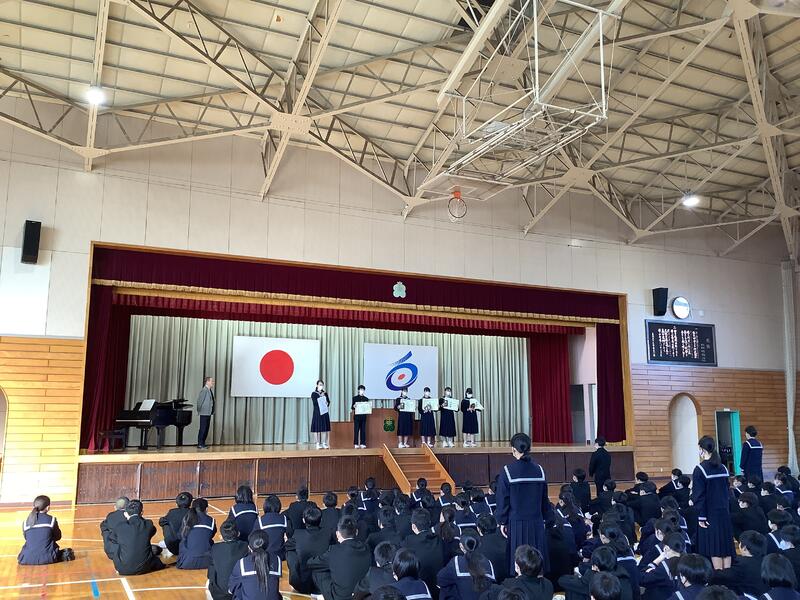 各種大会で良い成績を残した生徒が表彰され、今後の大会に向けた抱負を発表しました。呼名された生徒の返事は大きく、大変立派でした。今後の大会での活躍も期待しています!