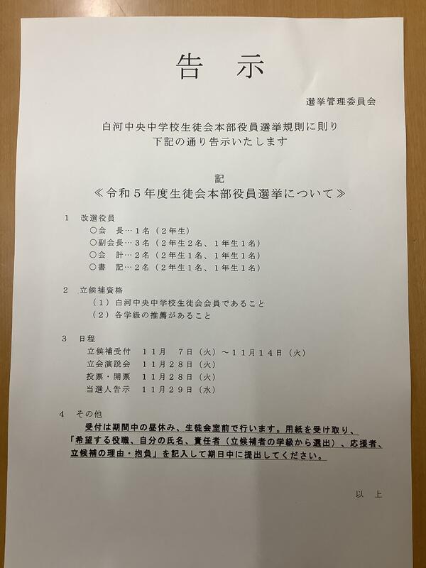 本日、令和5年度生徒会本部役員選挙が告示されました。