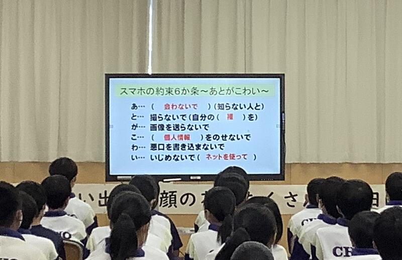 主任少年警察補導員の渡部裕絵様をお招きし、スマホやゲームの使い方についての話をして頂きました。インターネット上で知り合った人と会うことは、一生消すことのできない傷を負ってしまうことや、最悪の場合命を落とすことにつながってしまうとことを、実例をもとにご説明頂きました。最後に、スマホの約束6か条「あとがこわい」を教えていただきました。
