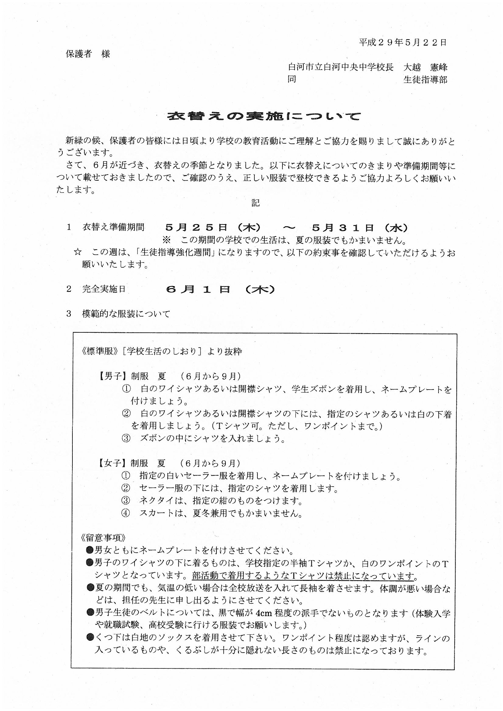 生徒には衣替えについてのプリントを本日配付いたしましたので、ご確認をお願いします。