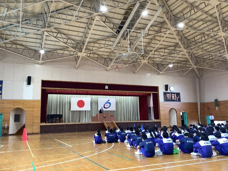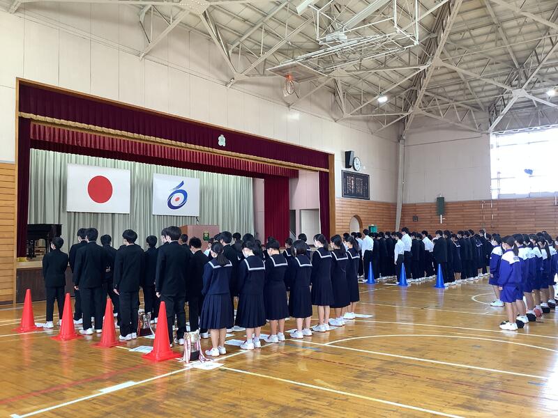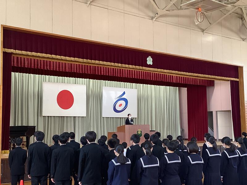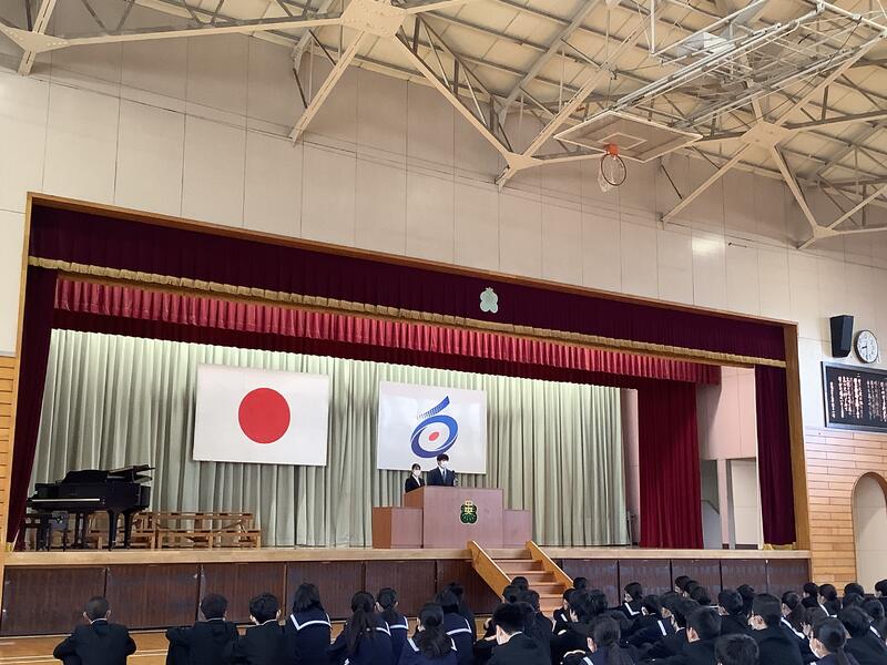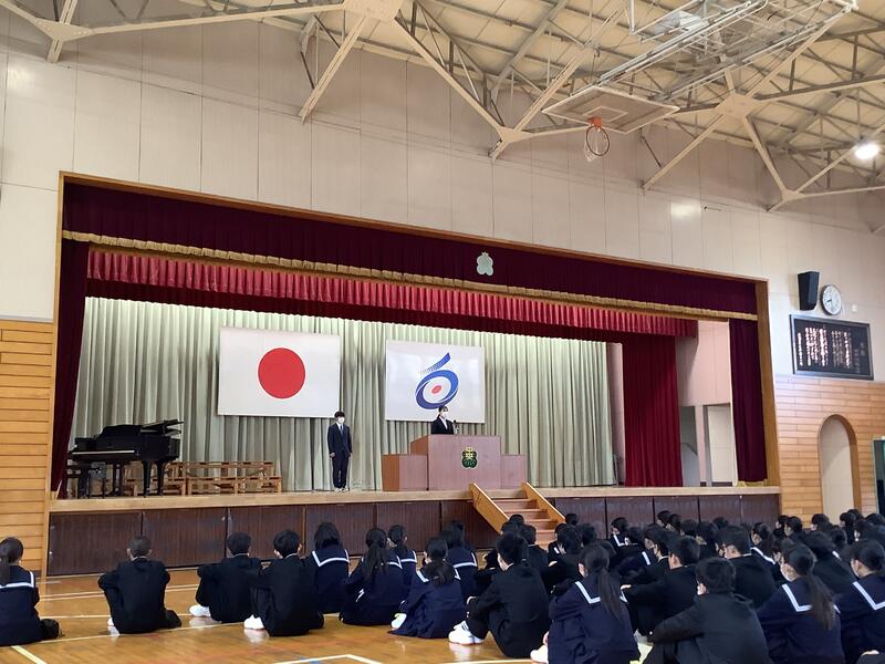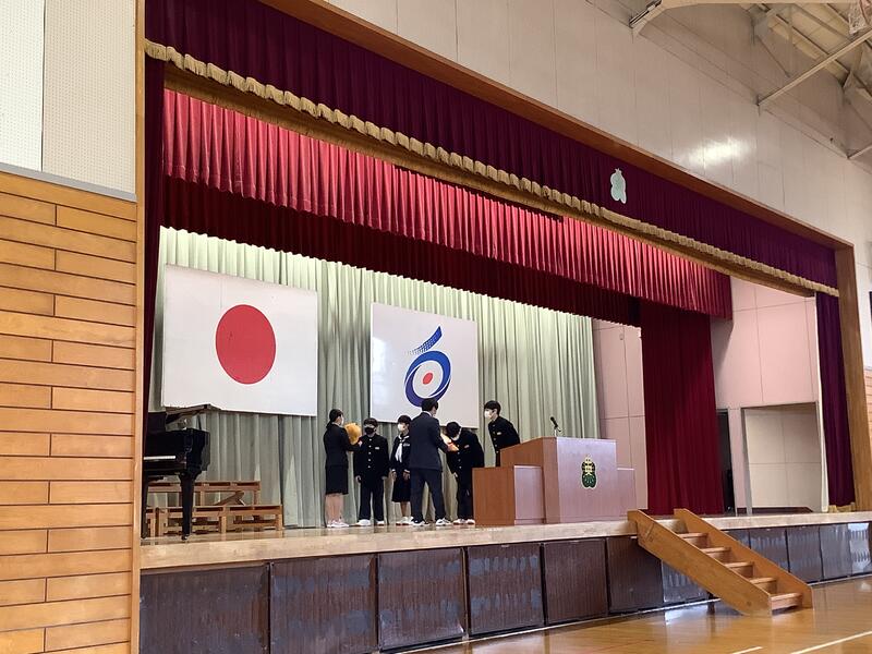 本日の朝会で、教育実習生の中村先生、小野先生からお別れのあいさつがあり、生徒から花束が贈呈されました。