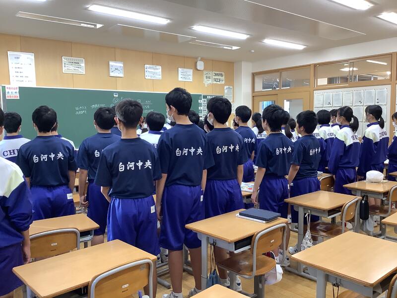 「2週間、ありがとうございました。白河中央中学校の皆さんの元気な挨拶や素敵な歌声に触れ、卒業生の1人としてとても幸せな時間でした。また、教育実習生として皆さんからたくさんのことを学ぶ機会となりました。これからも素敵な中学校生活を送ってください。」