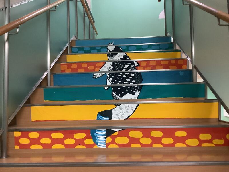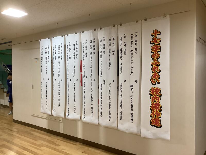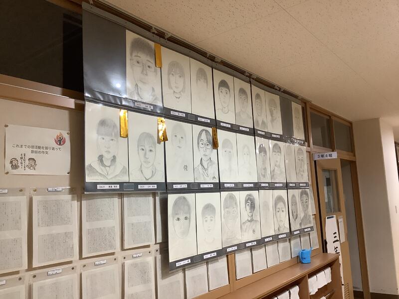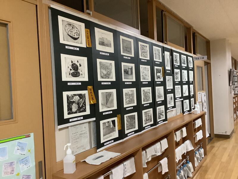 各教室前には美術の授業で制作した一人一人の作品が、各階多目的スペースには図書報道部で作成した新聞が展示されています。その他にも、各授業や部活動で作成した様々な展示があります。
