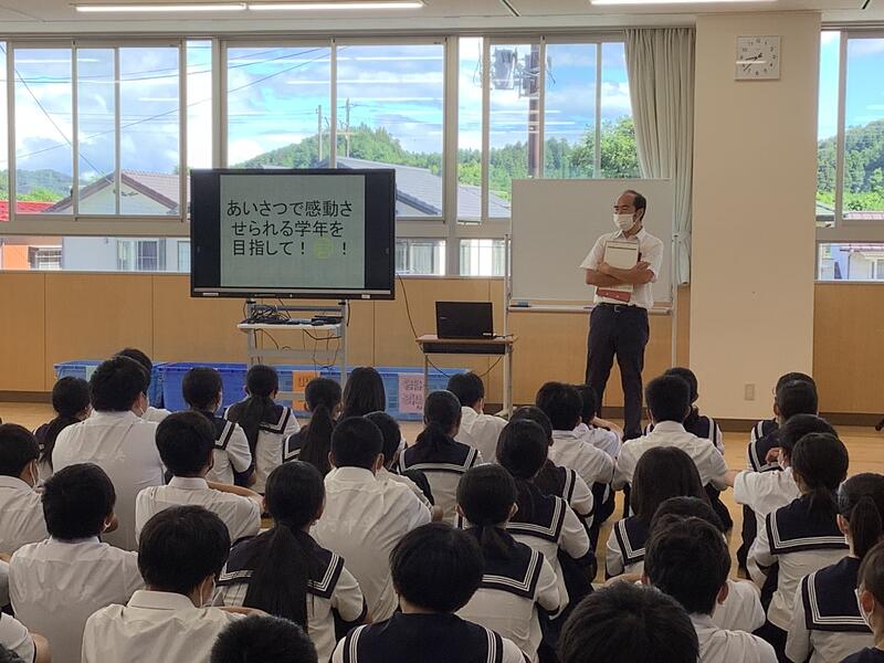 3学年主任から、1学期の良かった点と2学期へ向けて頑張って欲しい点や夏休みの学習の話がありました。