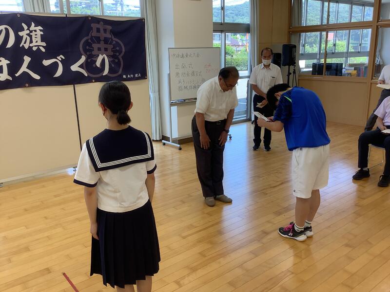 本日、本校にて、陸上競技部の東北・全国中学校体育大会出発式を行いました。