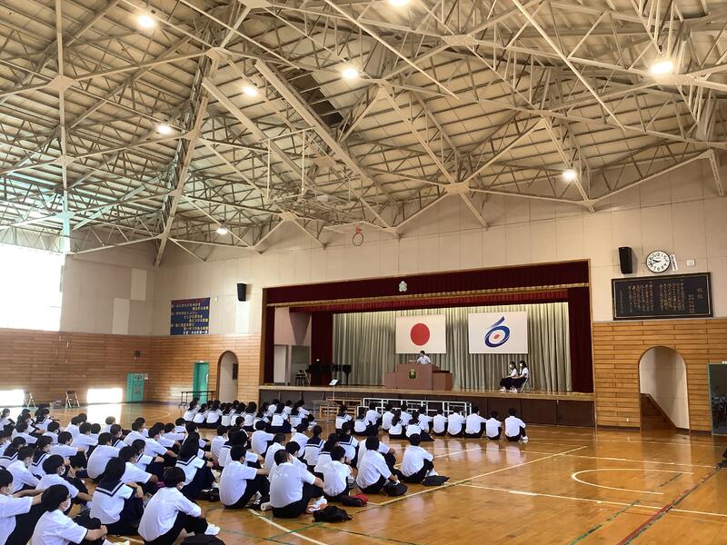 水筒の持参や座った姿勢で話を聞く等、熱中症対策を講じた中での始業式となりました。