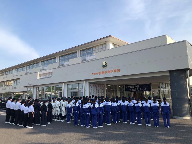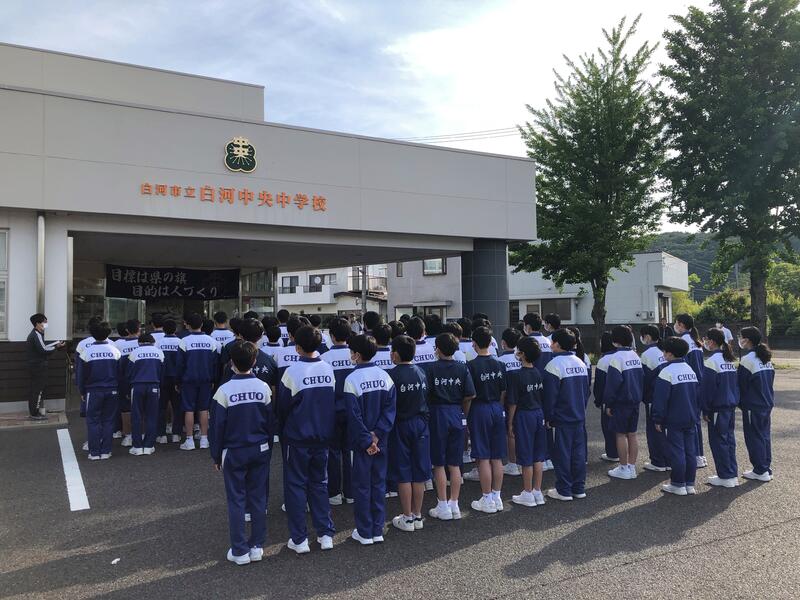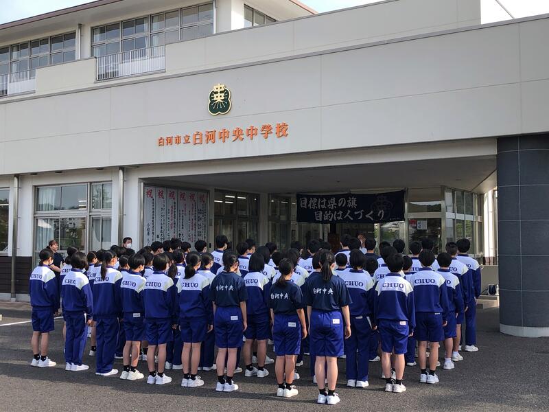 今日はいよいよ県南中体連総合大会です。3年生にとっては中体連総合大会が最後の大きな大会となります。県南大会を勝ち抜き、学校の目標である「県の旗」をどの部も獲得できるように頑張ってください!