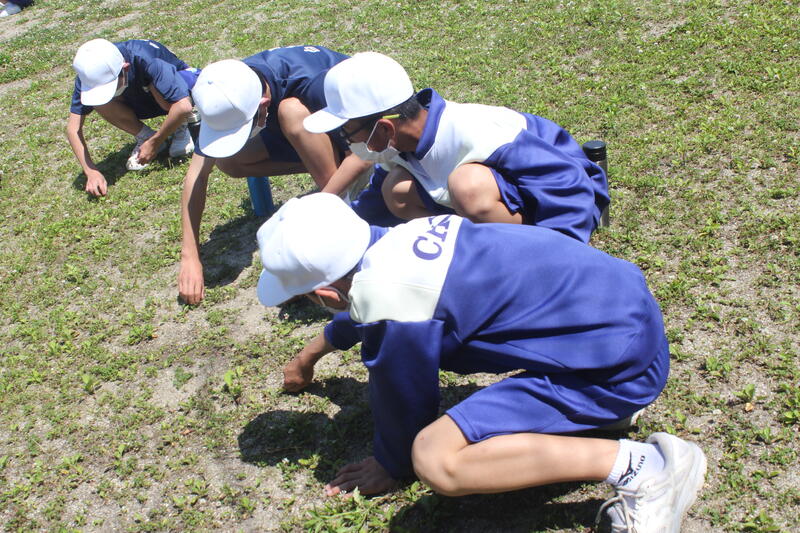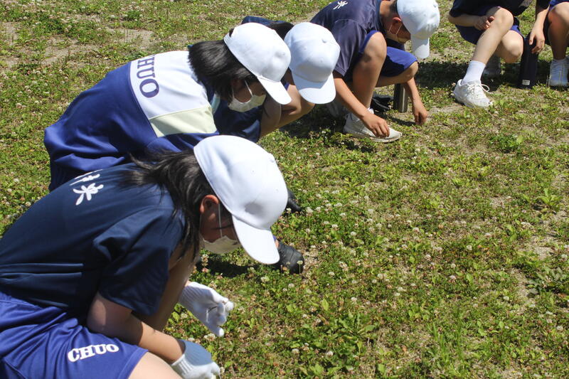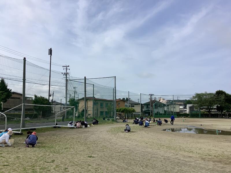 校庭の草が伸びているので、みんなで協力して除草作業を行いました。