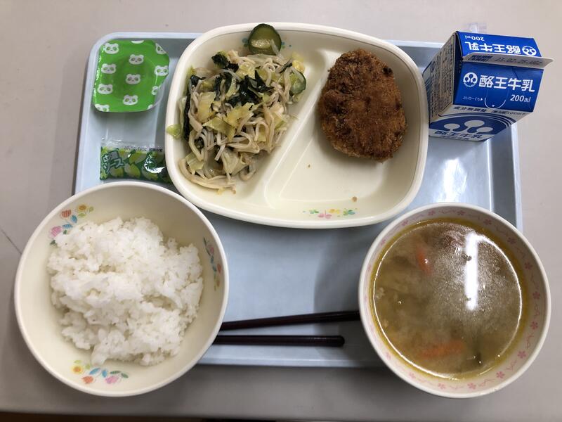 ごはん 牛乳 手作りメンチカツ もやしの香味あえ さつま汁 一口いちごゼリー