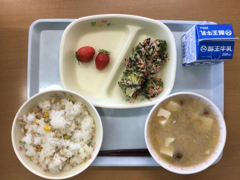 本日の献立は、三色ごはん、牛乳、ひじきのサラダ、なめこ汁、いちごでした。本日も栄養満点で、大変美味しくいただきました。