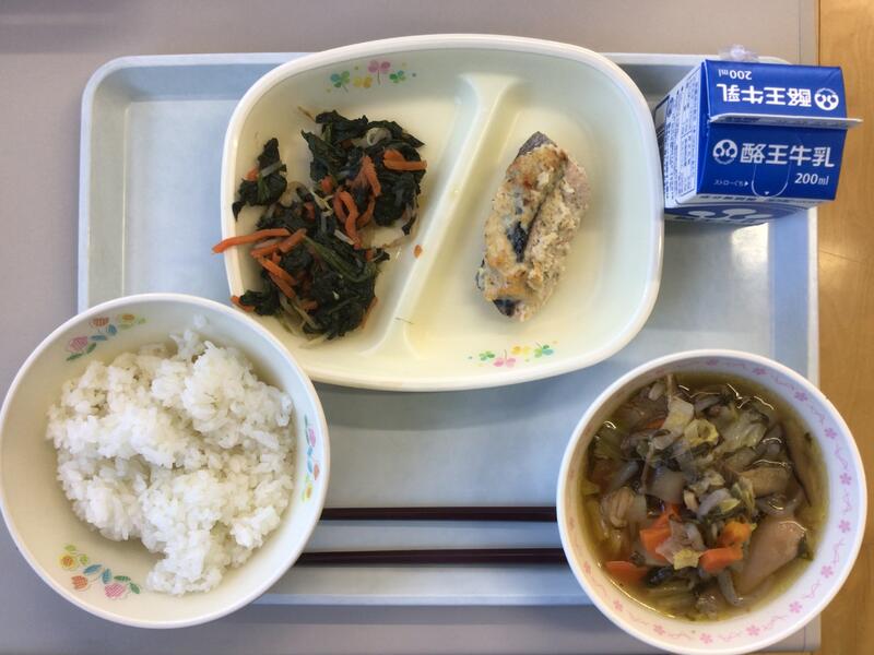 本日の献立は、ごはん、牛乳、サケのみそマヨ焼き、ほうれん草のおひたし、すき焼き煮でした。本日も大変美味しくいただきました。