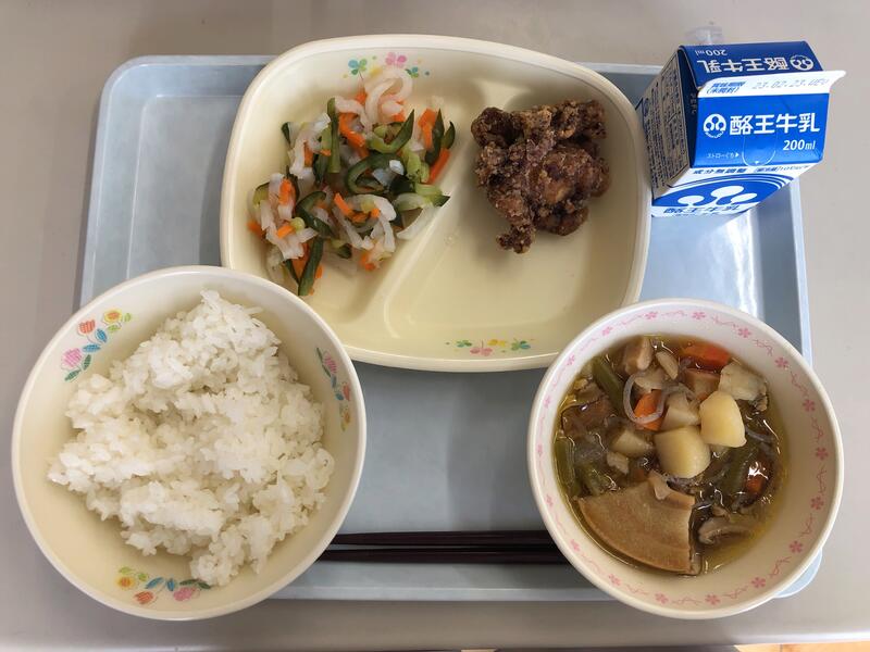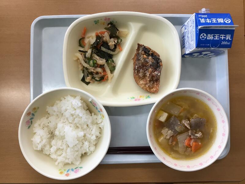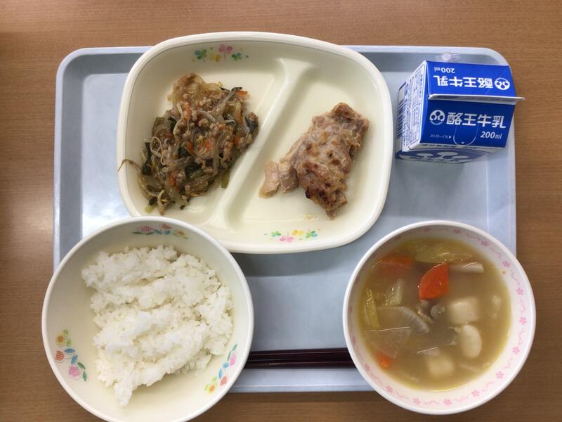 本日の献立は、ごはん、牛乳、鶏肉の香味焼き、もやしのひき肉炒め、いも団子汁でした。今日も大変美味しくいただきました。
