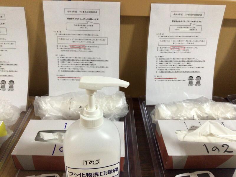 生徒の口腔内環境を整えることを目的として、木曜日に各学級のセットを養護教諭が準備し「フッ素洗口」に取り組んでいます。