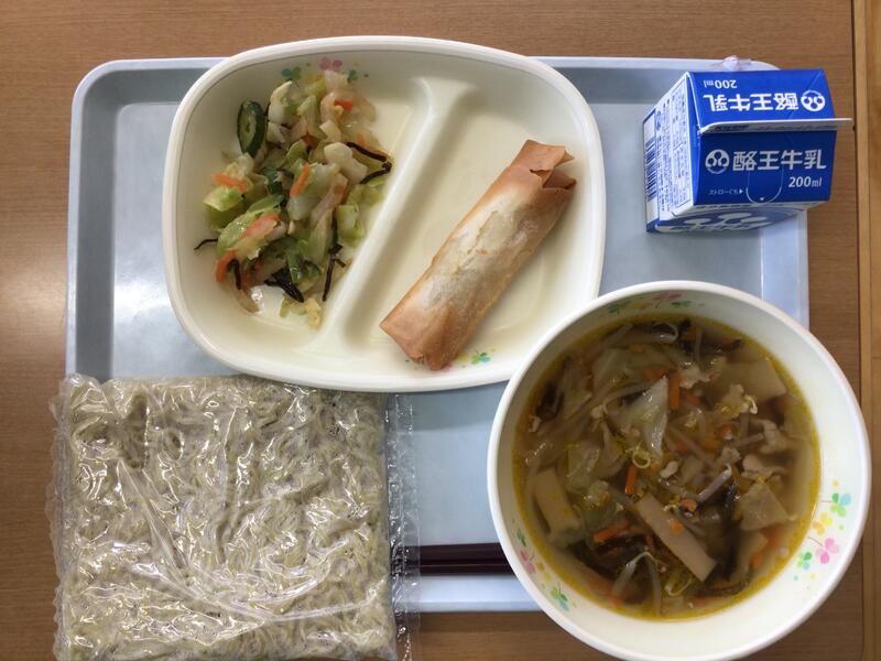 本日の献立は、五目タンメン、牛乳、春巻き、塩昆布あえでした。野菜たっぷりで本日も大変美味しくいただきました。