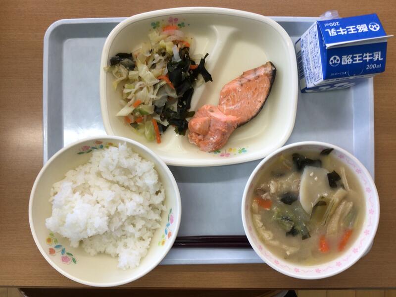 本日の献立は、〜始まりの給食〜として、ごはん、牛乳、鮭の塩焼き、もみ漬け、すいとん汁でした。大変美味しくいただきました。