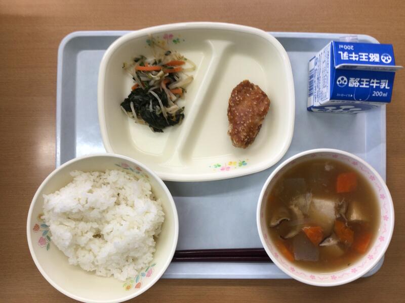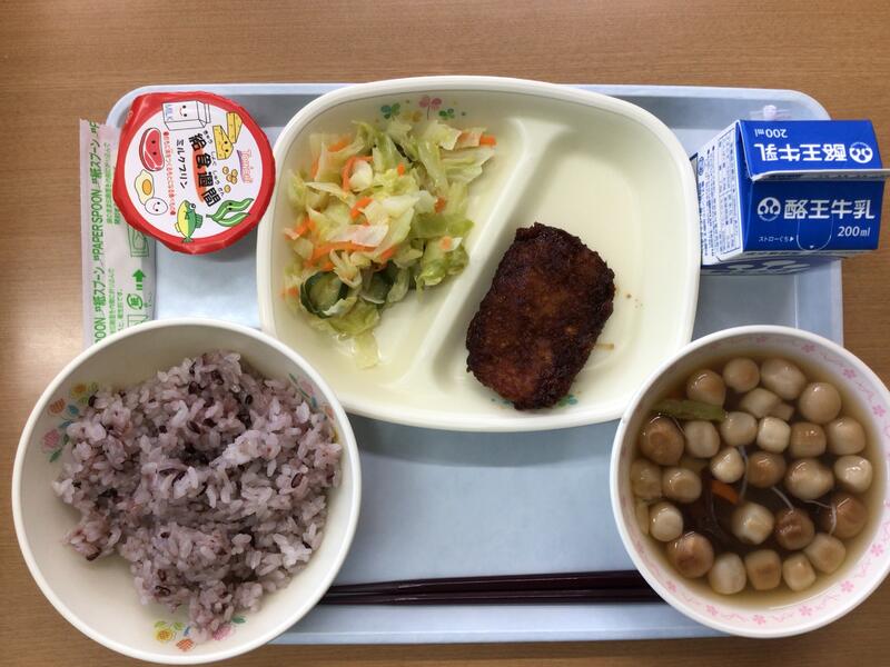 本日の献立は、[全国学校給食週間]〜会津〜として、紫黒米入りごはん、牛乳、ソースカツ、キャベツのサラダ、こづゆ、ミルクプリンでした。会津の郷土料理、大変美味しくいただきました。