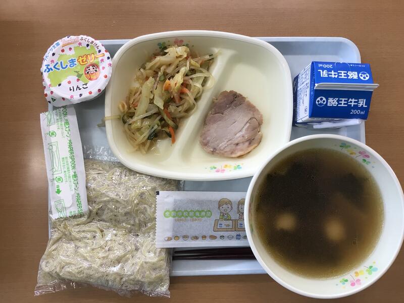 本日の献立は、[全国学校給食週間]〜中通り〜として、白河ラーメン、牛乳、焼きのり、チャーシュー、春雨サラダ、県産りんごゼリーでした。白河ラーメンをメニューに入れるため、特別に麺を作ってくださったそうです。本日も大変美味しくいただきました。