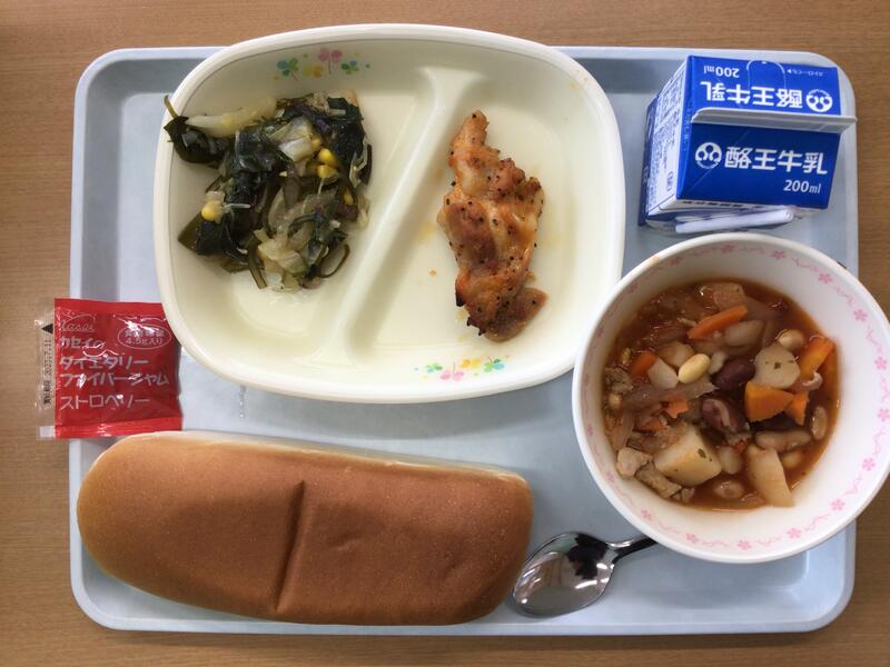 本日の献立は、コッペパン、牛乳、いちごジャム、チキンのガーリック焼き、海藻サラダ、ポークビーンズでした。タンパク質多め。今日も大変美味しくいただきました。