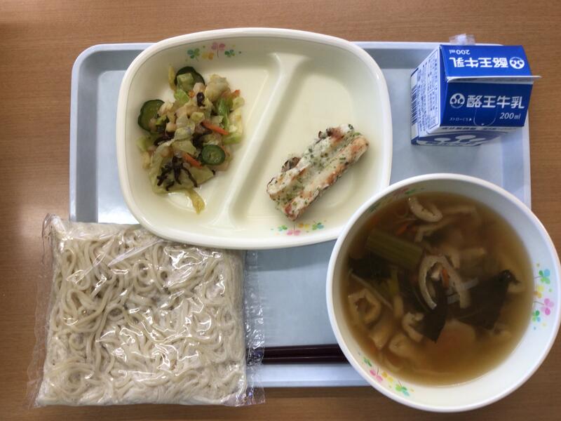 今日の献立は、きつねうどん、牛乳、ちくわのいそべ揚げ、塩昆布あえでした。大変美味しくいただきました。