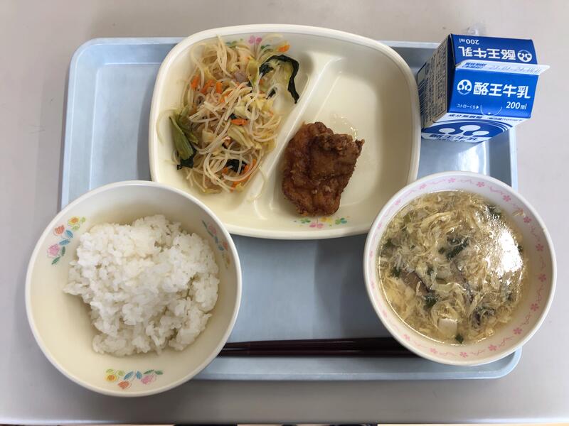ごはん 牛乳 鶏のから揚げ 五目ビーフン きのこ中華スープ