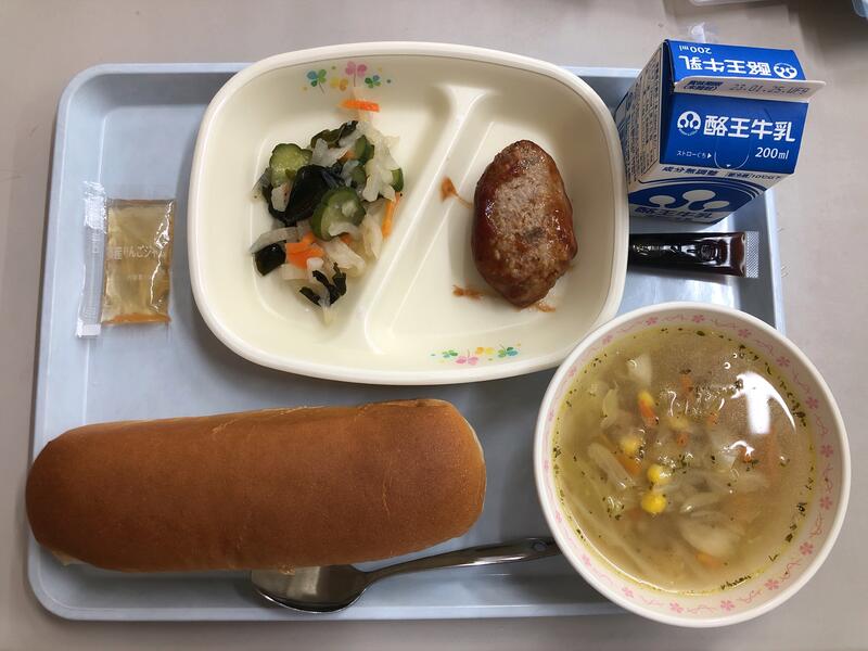 コッペパン リンゴジャム 牛乳 ミルメーク ハンバーグケチャップソースがけ 大根サラダ コンソメスープ