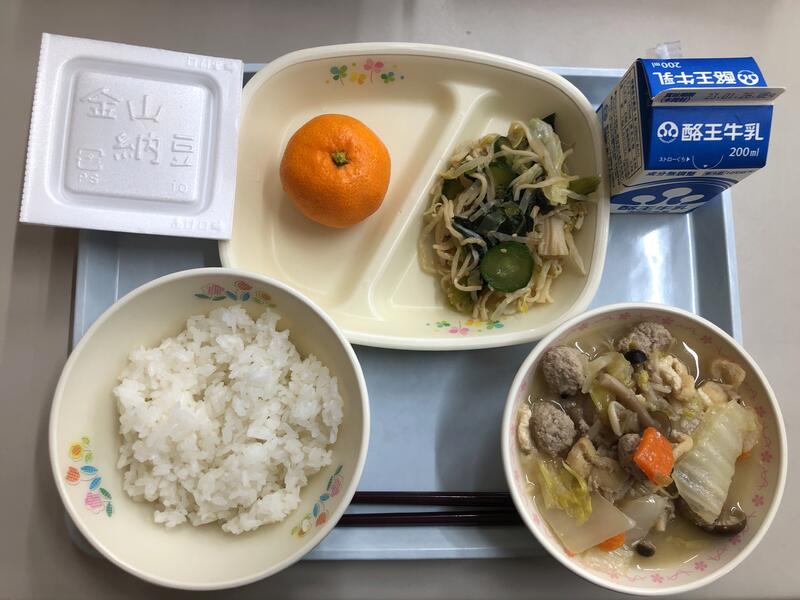 ごはん 牛乳 納豆 もやしの香味あえ みそちゃんこ汁 みかん