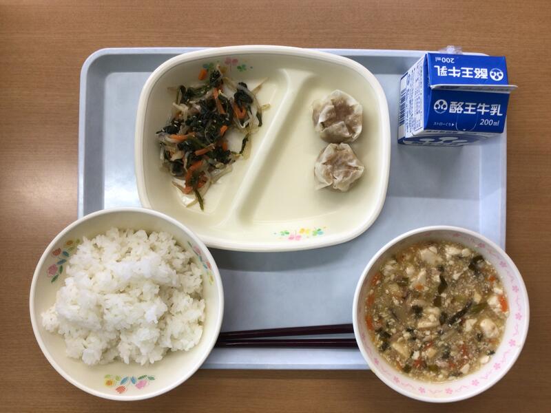 本日の献立は、ごはん、牛乳、シューマイ、ナムル、マーボー豆腐でした。大変美味しくいただきました。ありがとうございました。
