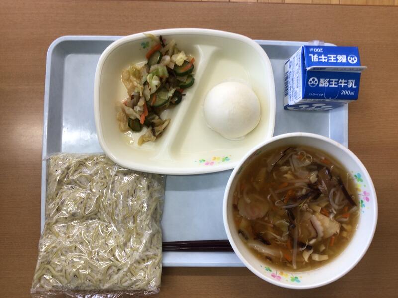 今日の献立は、五目あんかけラーメン、牛乳、肉まん、塩昆布あえでした。今日も大変美味しくいただきました。
