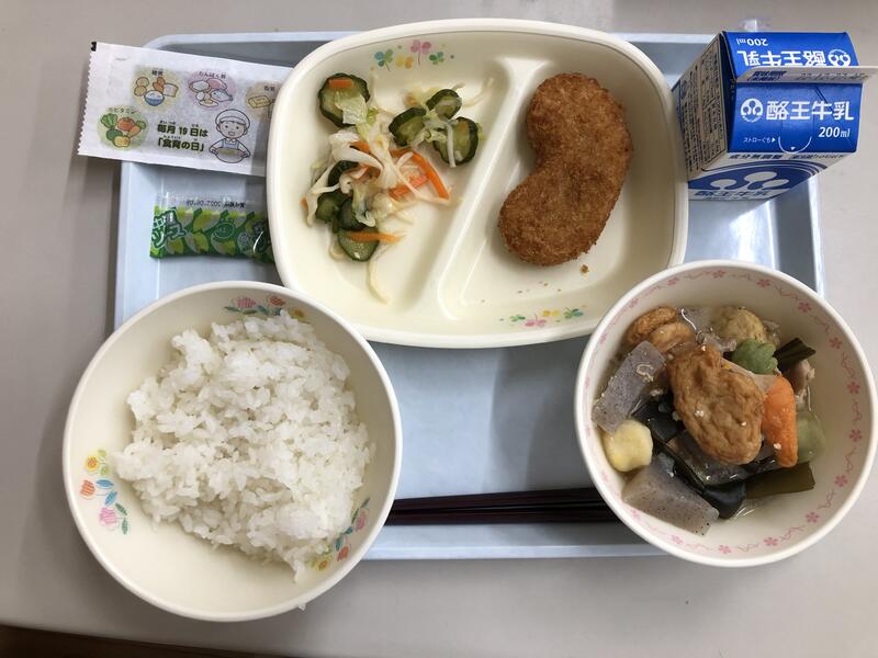 ごはん 味付けのり 牛乳 白花豆のコロッケ 糸かまサラダ おでん