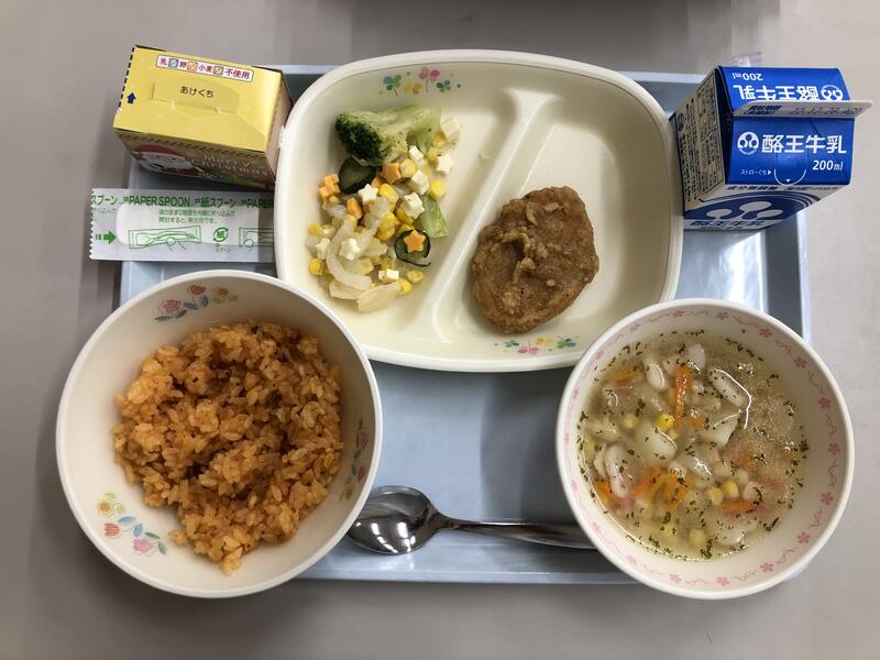 チキンライス 牛乳 フライドチキン お星さまサラダ スノースープ クリスマスデザート