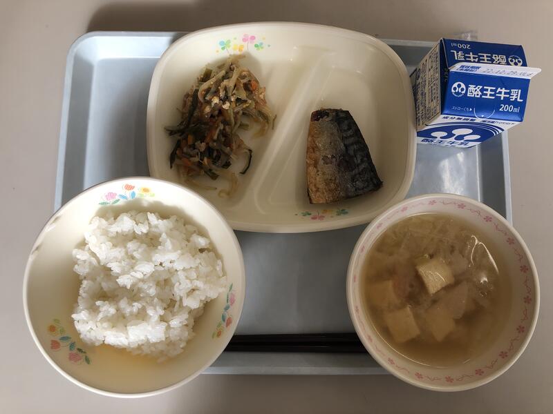 ごはん 牛乳 サバの塩焼き もやしのひき肉炒め 具だくさん汁