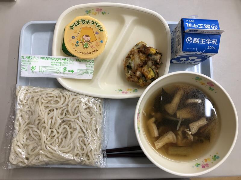 きつねうどん 牛乳 かぼちゃ入りかき揚げ 冬至デザート