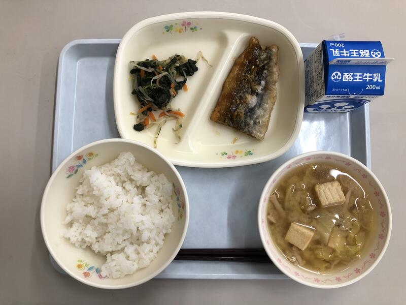 ごはん 牛乳 さんまのかば焼き ほうれん草のいそあえ 白菜と厚揚げのみそ汁