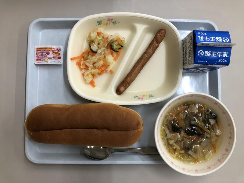 せわれコッペパン 牛乳 ロングウインナー キャベツサラダ ファイバースープ