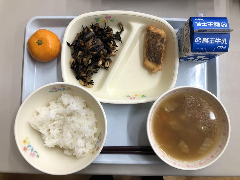 ごはん 牛乳 真鯛の塩から揚げ ひじき煮 だまこ汁 みかん