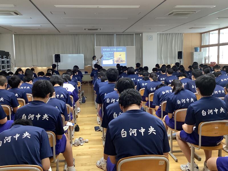 また、5時間目には2年生で白河の歴史・文化再発見事業が行われました。今回は白河の偉人、松平定信について、講師の先生をお呼びしてたくさんのことを学びました。このあと、歴史の授業でも松平定信については学ぶことになりますので、今回の講話を生かしていきましょう!