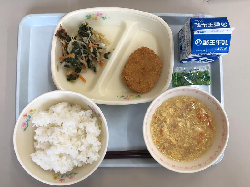 ごはん 牛乳 キャベツメンチカツ ほうれん草のおかかあえ かきたま汁
