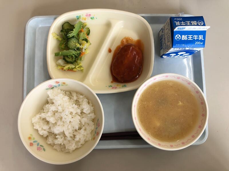 ごはん 牛乳 手作りハンバーグデミグラスソースがけ ブロッコリーサラダ なめこ汁