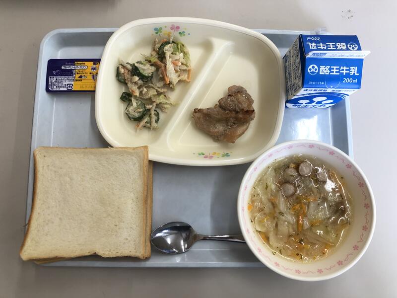 食パン 牛乳 ブルーベリー&マーガリン 鶏肉の照り焼き ごぼうサラダ キャベツのスープ