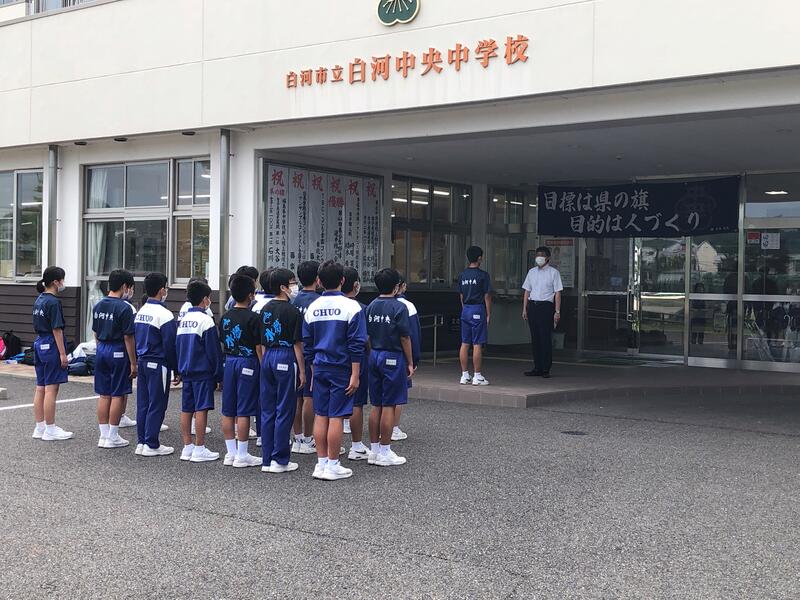 先程、県南水泳大会に出場する選手たちが学校を出発していきました。
