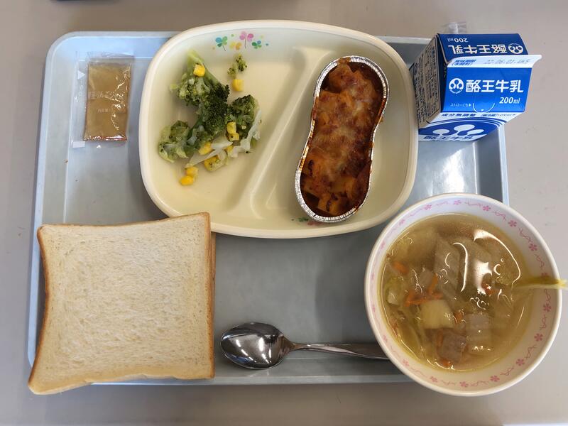 食パン 牛乳 りんごジャム ポテトミートグラタン グリーンサラダ 野菜スープ