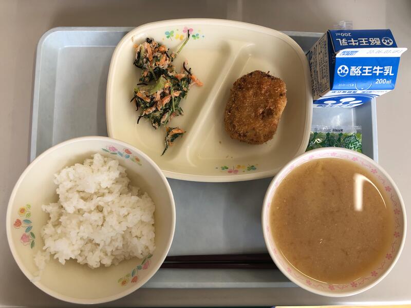 ごはん 牛乳 手作りコロッケ ひじきとツナのサラダ なめこ汁