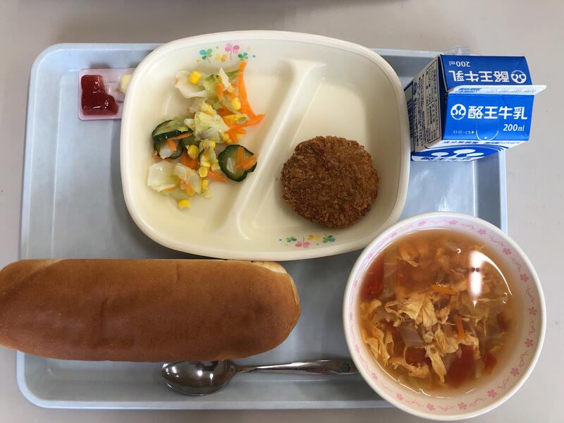 コッペパン 牛乳 いちご&マーガリン かぼちゃチーズフライ コールスローサラダ トマトスープ