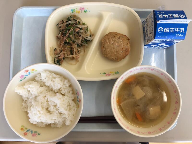 ごはん 牛乳 豆腐ハンバーグ和風ソースがけ もやしとにらのツナあえ さつま汁