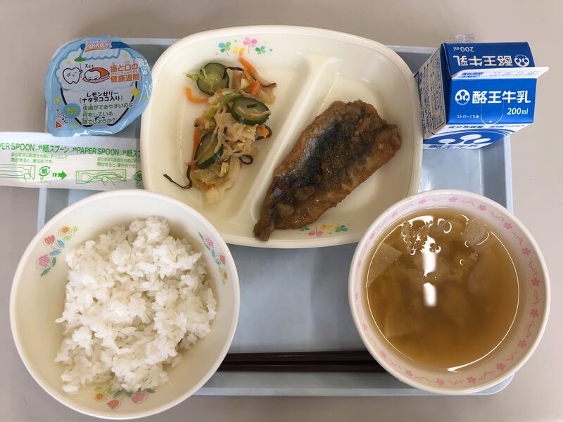 ごはん 牛乳 いわしのかば焼き かみかみサラダ 根菜汁 レモンゼリー
