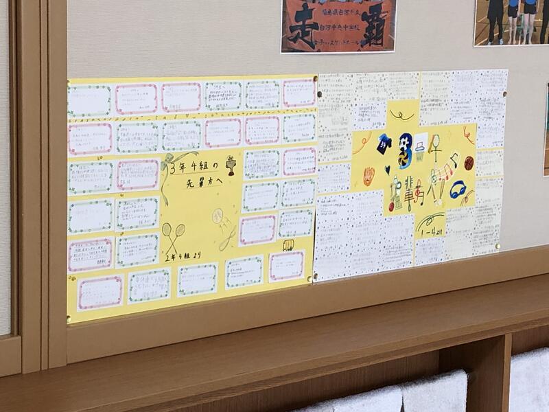 先週の金曜日、1時間目には3年生で学年壮行会があり、各運動部の気合の入った意気込みの発表、文化部からの応援メッセージ、とても良い壮行会になりました。また、お昼の時間に最後の中体連を迎える3年生へ、1・2年生からの温かいメッセージが手渡しされました。1・2年生、文化部の応援を力にかえて、全力で戦って来てください!!!