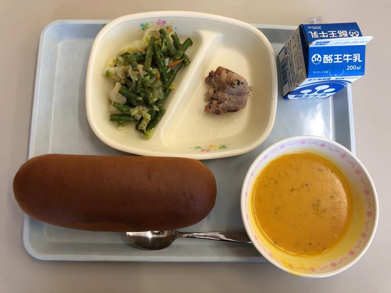 黒糖パン 牛乳 鶏肉のハーブ焼き アスパラサラダ パンプキンポタージュ