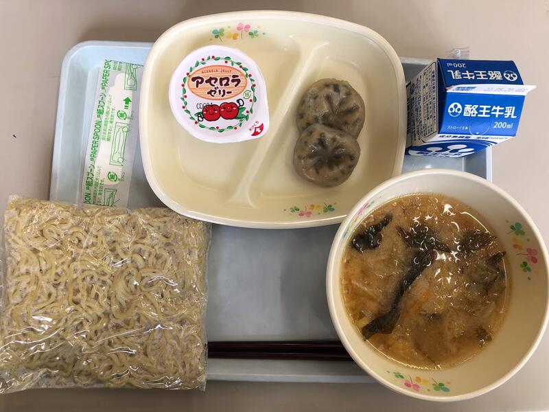 肉みそラーメン 牛乳 にらまんじゅう アセロラゼリー