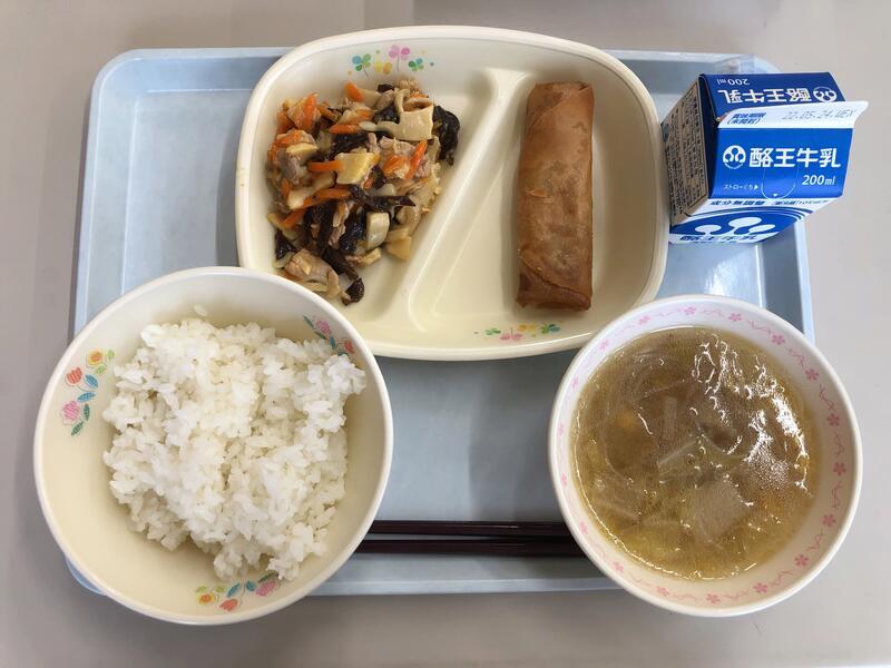 ごはん 牛乳 春巻き 豚肉とたけのこの炒め物 春雨スープ